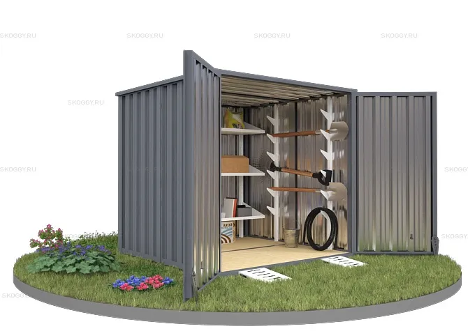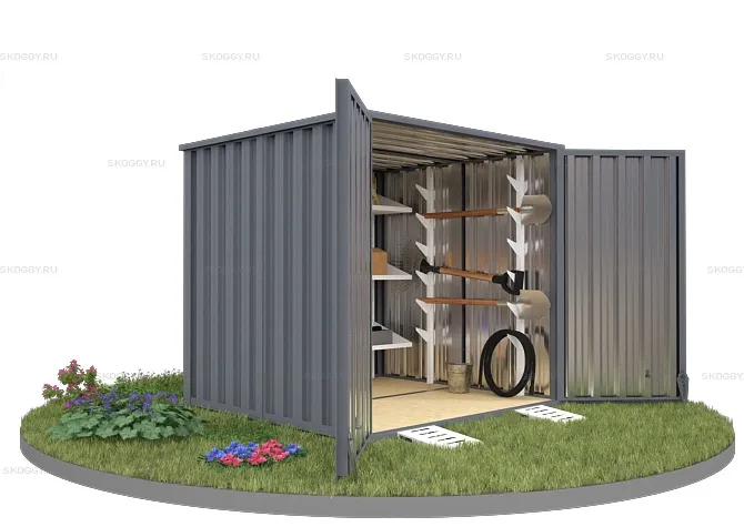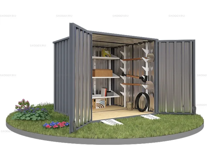 Конструкция выполнена из металла толщиной 0,65 мм. Для каркаса прикрепляются профлисты с помощью болтов и саморезов. Устанавливается дверь и ворота. При необходимости компания SKOGGY может предложить дополнительное оборудование, такое как: пандусы, стеллажи для хранения инструментов, специальную систему для хранения шин и многое другое.