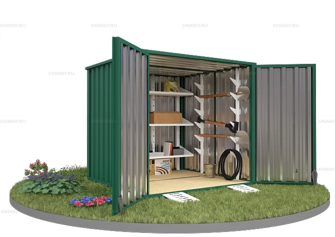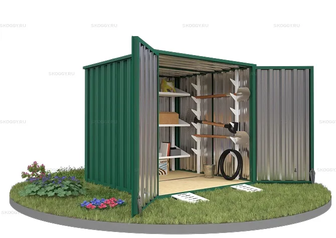 Конструкция выполнена из металла толщиной 0,65 мм. Для каркаса прикрепляются профлисты с помощью болтов и саморезов. Устанавливается дверь и ворота. При необходимости компания SKOGGY может предложить дополнительное оборудование, такое как: пандусы, стеллажи для хранения инструментов, специальную систему для хранения шин и многое другое.