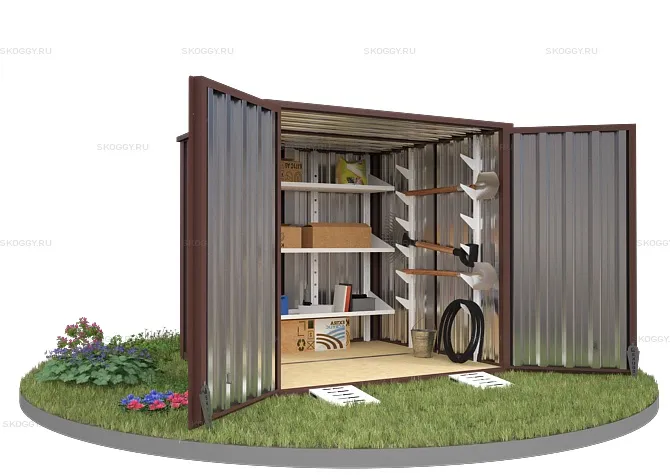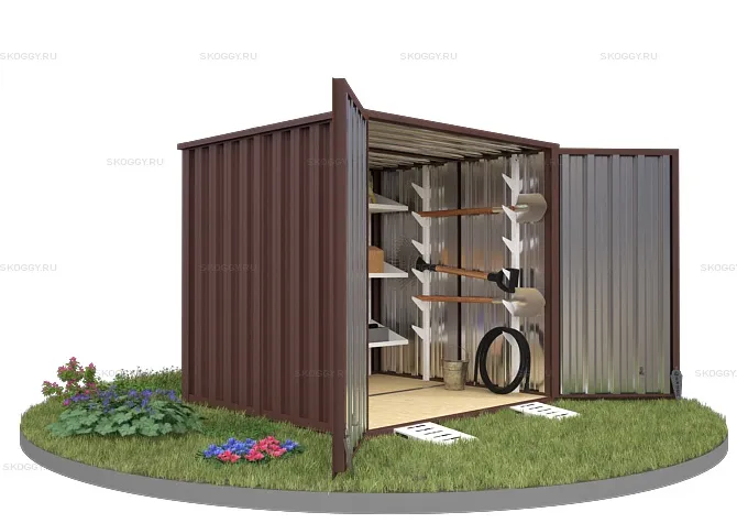 Конструкция выполнена из металла толщиной 0,65 мм. Для каркаса прикрепляются профлисты с помощью болтов и саморезов. Устанавливается дверь и ворота. При необходимости компания SKOGGY может предложить дополнительное оборудование, такое как: пандусы, стеллажи для хранения инструментов, специальную систему для хранения шин и многое другое.