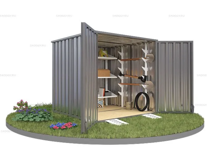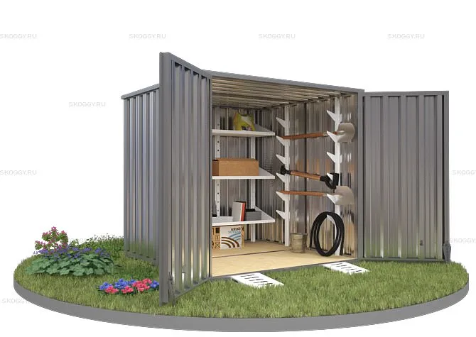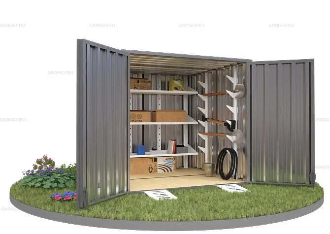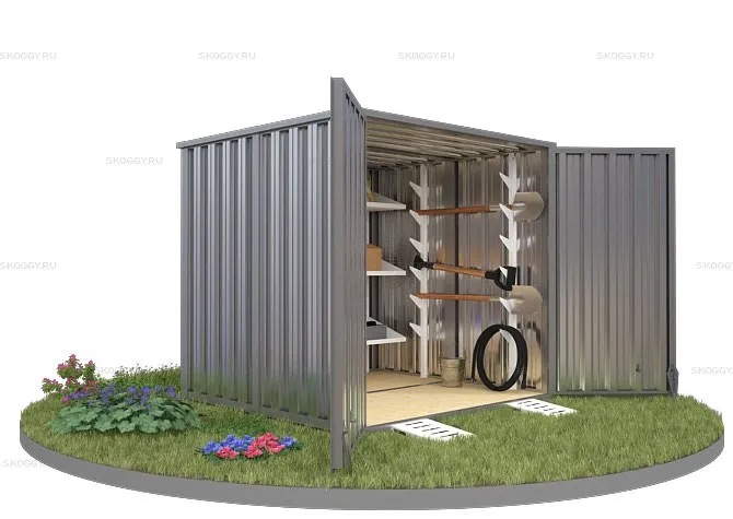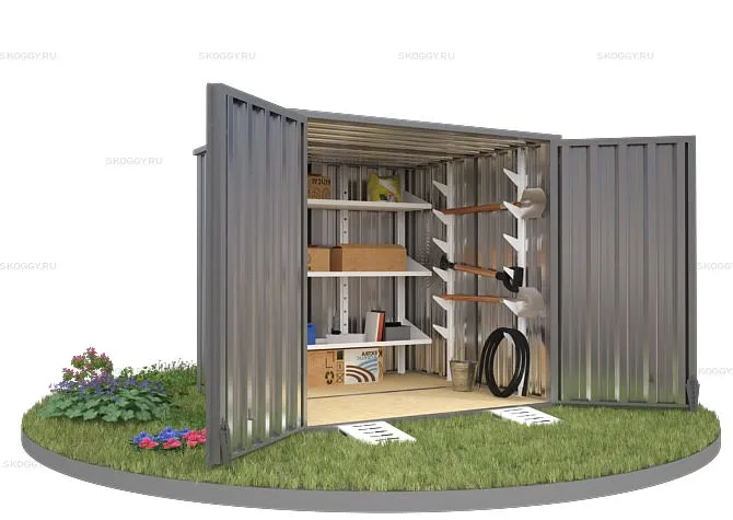 Конструкция выполнена из металла толщиной 0,65 мм. Для каркаса прикрепляются профлисты с помощью болтов и саморезов. Устанавливается дверь и ворота. При необходимости компания SKOGGY может предложить дополнительное оборудование, такое как: пандусы, стеллажи для хранения инструментов, специальную систему для хранения шин и многое другое.