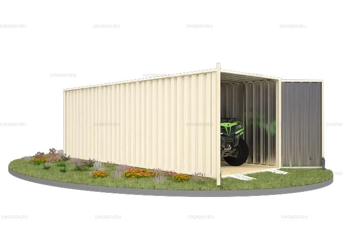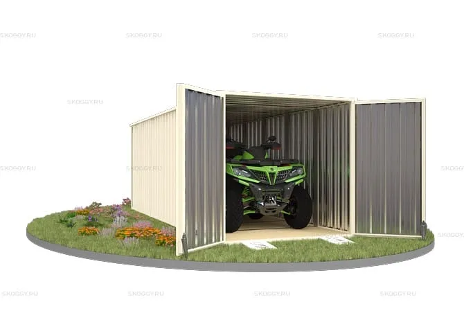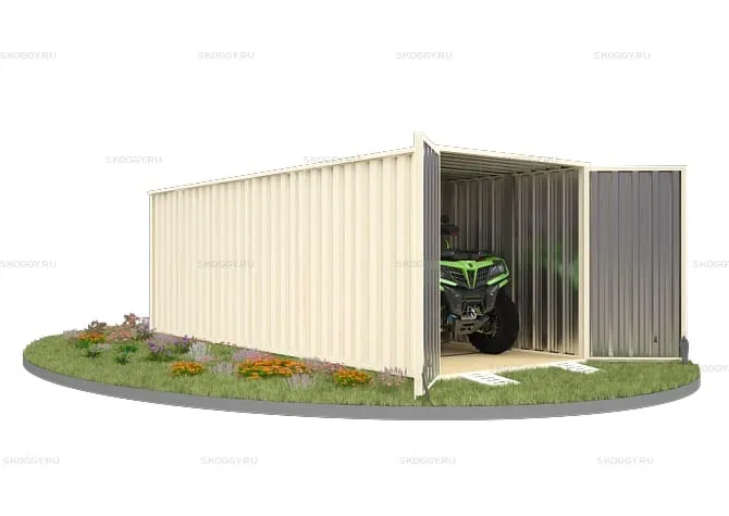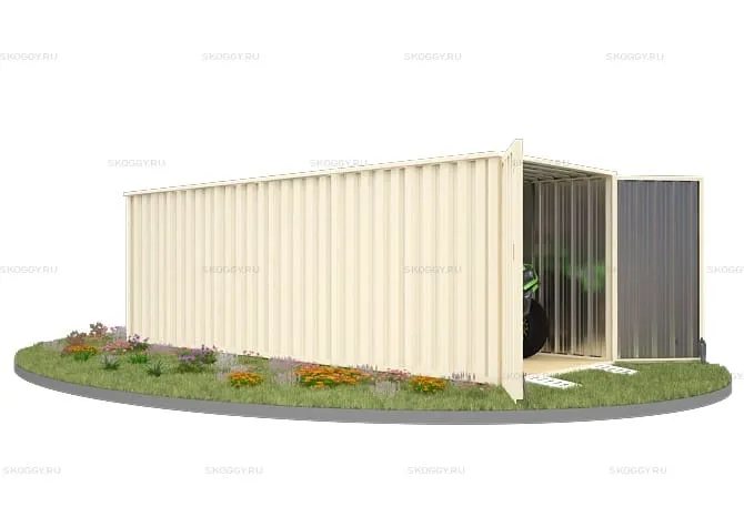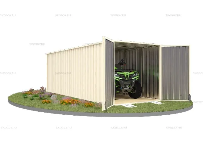 Контейнер SKOGGY состоит из крыши, стен, двери и ворот. В свою очередь они сделаны из металла и крепятся друг к другу с помощью саморезов на каркас, состоящий из металлических профилей толщиной 0,65 мм. При необходимости увеличения длины можно дополнительно установить модуль, длина которого составляет 1 метр.