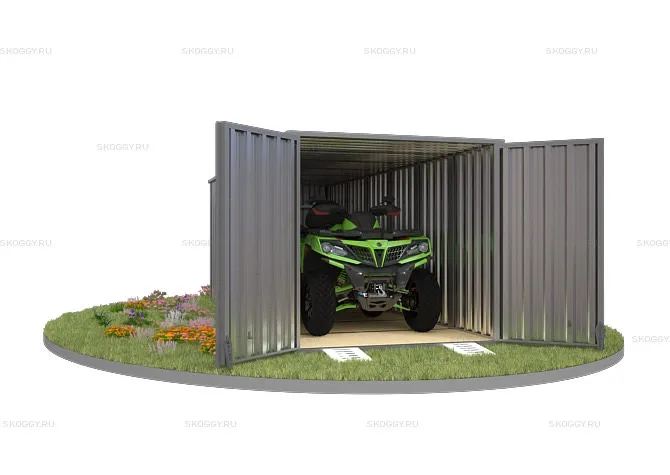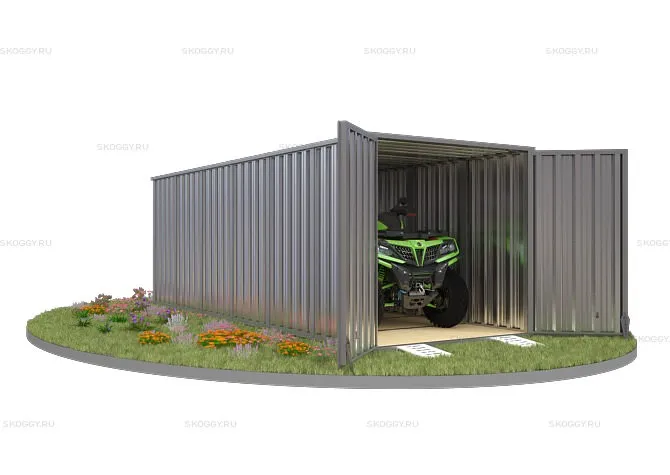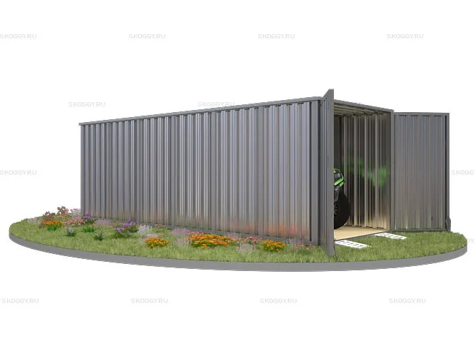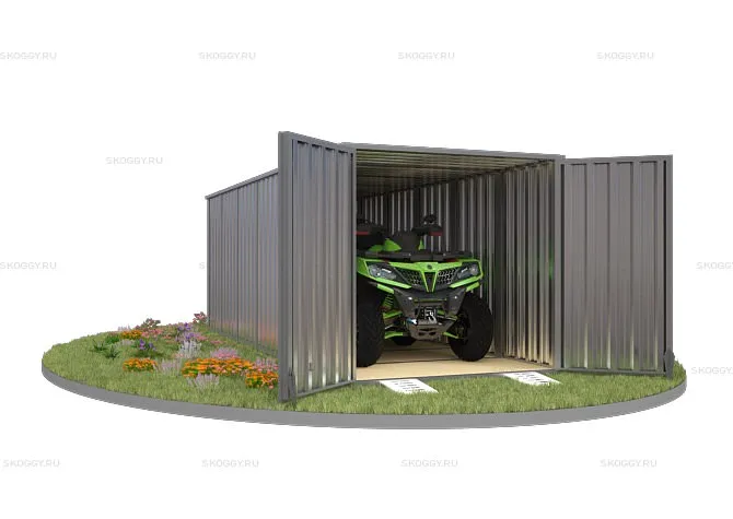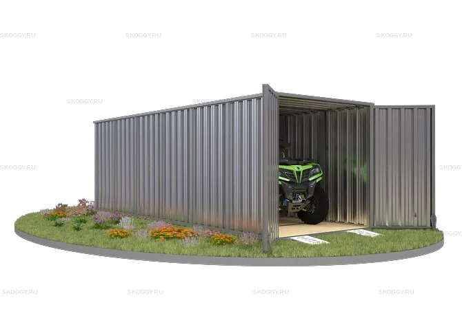 Контейнер SKOGGY состоит из крыши, стен, двери и ворот. В свою очередь они сделаны из металла и крепятся друг к другу с помощью саморезов на каркас, состоящий из металлических профилей толщиной 0,65 мм. При необходимости увеличения длины можно дополнительно установить модуль, длина которого составляет 1 метр.